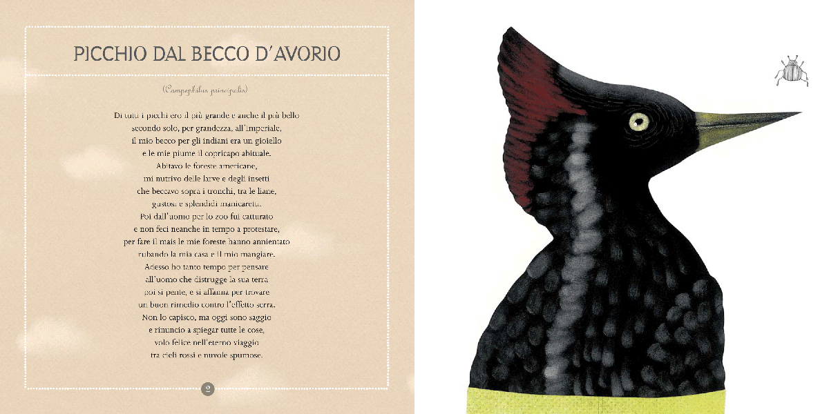 Parliamo di leggerezza questo mese su Zebuk, parliamo di albi illustrati per ragazzi che ci fanno volare alti con la fantasia, ma parlare di leggerezza non significa parlare di superficialità. E allora andiamo nel profondo, con la prima considerazione che salta fuori da questa bella raccolta di venti specie di animali che – anche soprattutto a causa della mano dell’uomo – non esistono più: la conoscenza è sempre un fatto positivo, soprattutto quando si parla di conoscenza di chi è diverso da noi.