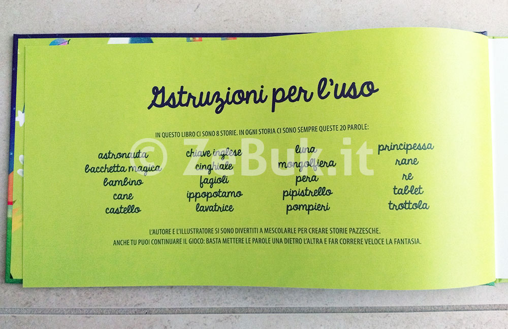 Prendete una Luna, una Pera, un Astronauta, una Chiave inglese, una Principessa, una Bacchetta Magica, un Cinghiale, una Mongolfiera, due Rane, un Bambino, due Fagioli, un Re, un Cane, un Ippopotamo, un Pipistrello, un Tablet, un Castello, una Lavatrice, due Pompieri e una trottola.