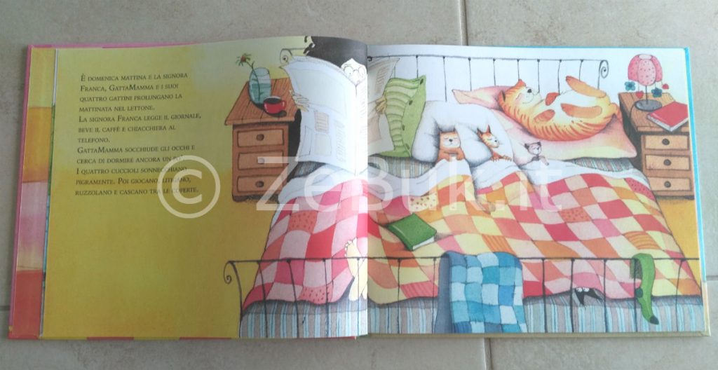 E’ domenica mattina e la signora Franca, GattaMamma e i suoi quattro gattini prolungano la mattinata nel lettone.