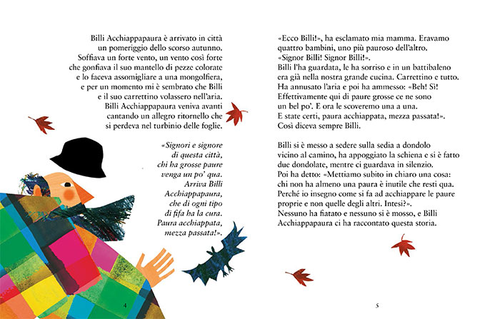 Billi Acchiappapaura è arrivato in città un pomeriggio dello scorso autunno. Soffiava un forte vento, un vento così forte che gonfiava il suo mantello di pezze colorate e lo faceva assomigliare a una mongolfiera, e per un momento mi è sembrato che Billi e il suo carrettino volassero nell’aria. Billi Acchiappapaura veniva avanti cantando un allegro ritornello che si perdeva nel turbinio delle foglie.