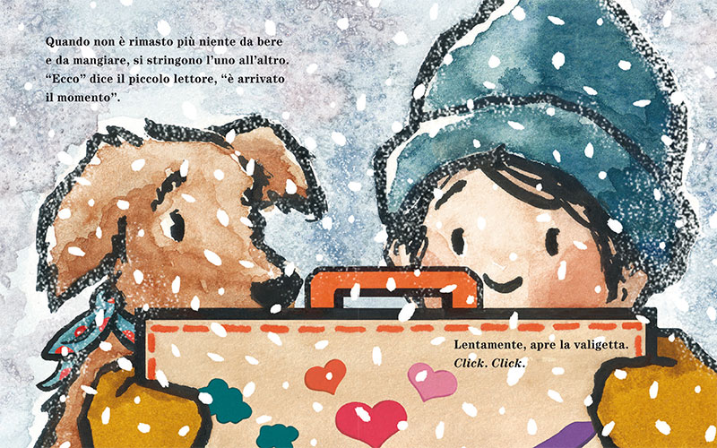 Dopo aver fatto festa con il suo cagnolino, il bambino si siede, apre la valigetta e… ne estrare un libro.