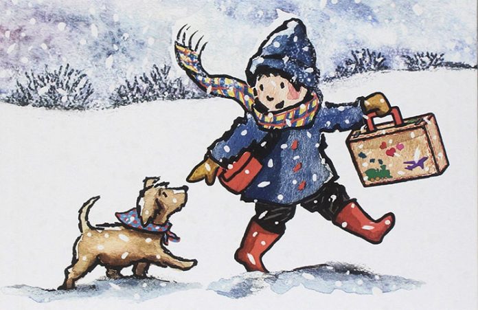 Il piccolo lettore ha un cagnolino di colore marrone, una robusta valigetta e una slitta rossa, che trascina sulla neve con una lunga corda.