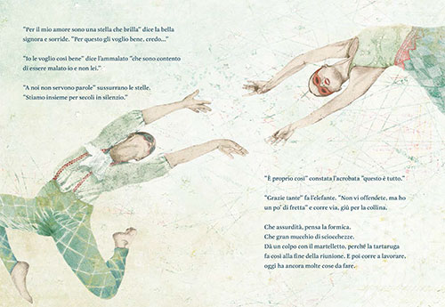 “Io non posso fare a meno del sole” risponde il melo. “La cosa strana è che se ho vicino la mia amata, faccio prendere tutto il sole a lei. Quando uno fa cose così, lo sa, di essere innamorato.”