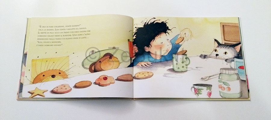“è ora di fare colazione, venite bambini!” urla la mamma. Lisa conta i biscotti sul tavolo. Li mette in fila: ecco un treno con dieci vagoni che corrono veloci verso il burrone. Uno dopo l’altro spariscono nella tazza e si alzano onde di latte…