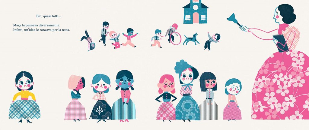 La storia di Mary è corredata da bellissime illustrazioni , coloratissime, che ben rappresentano con il tratto deciso e i colori scelti, su tutti il giallo carico degli abiti della protagonista, il carattere di Mary e la sua audacia, la passione e la forza delle sue idee.