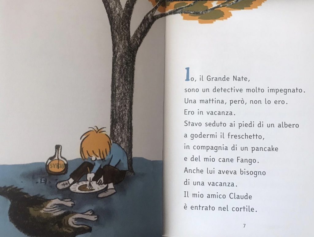 “Io, il Grande Nate, sono un detective molto impegnato. Una mattina, però, no lo ero. Ero in vacanza. Stavo seduto ai piedi di un albero a godermi il freschetto, in compagnia di un pancake e del mio cane Fango.”