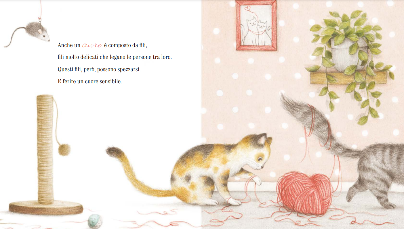Una storia tenera e delicatissima, che si srotola lungo il filo dei sentimenti e dei legami. A farci compagnia un bel po’ di gatti, micini teneri e coccolosi che giocano e litigano, che fanno pace e tornano amici.