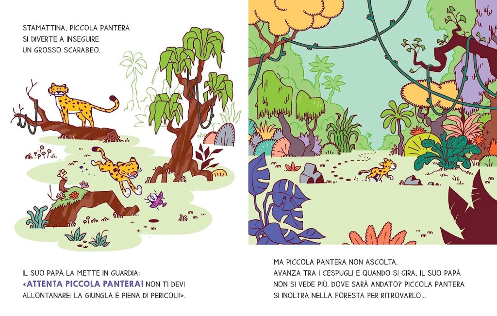 ATTENTA PICCOLA PANTERA! NON TI DEVI ALLONTANARE: LA GIUNGLA È PIENA DI PERICOLI.