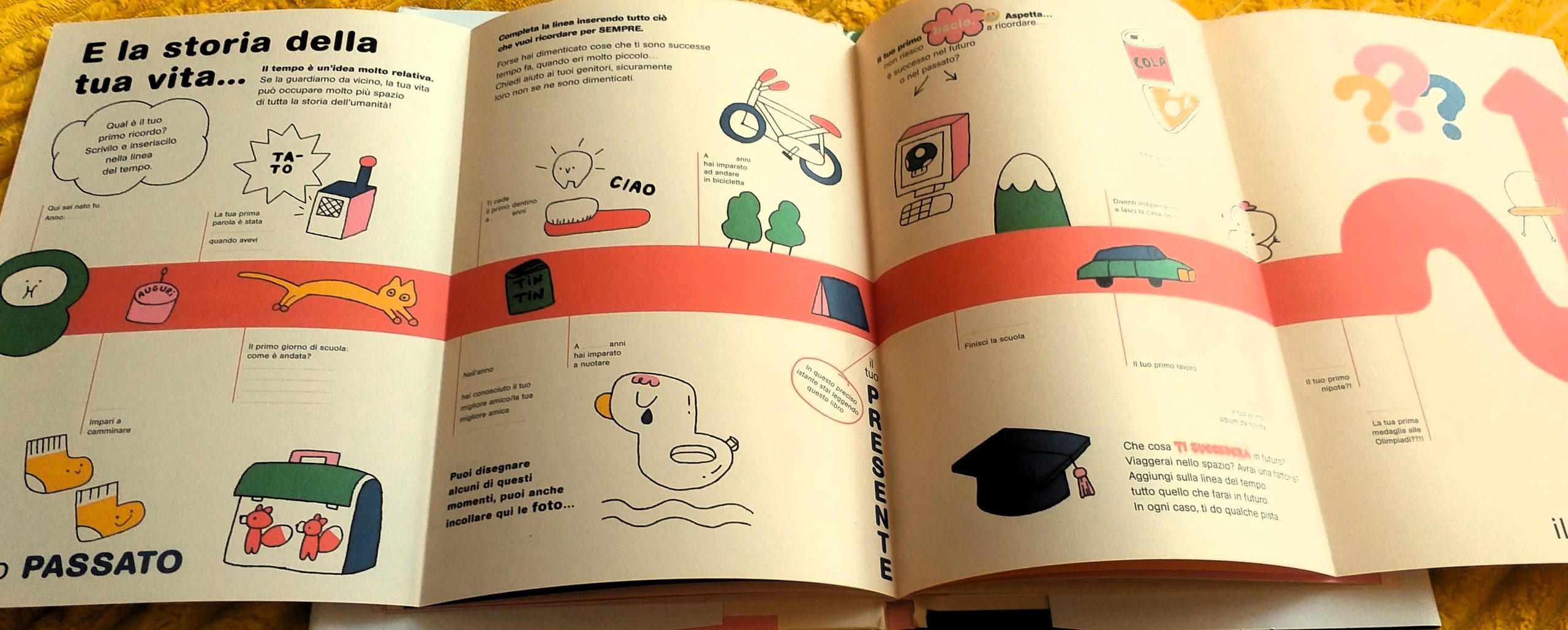 Pagine coloratissime, disegni accattivanti, spazi da riempire di informazioni. E linee del tempo, sogni e desideri, gusti di oggi e di domani e una parola magica che torna più volte: capsula del tempo.