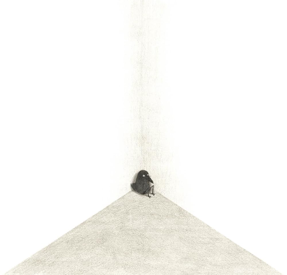 L’angolo di Zo-O è un silent book con all’interno pochissime parole. È un albo geniale che riesce a far vivere sotto gli occhi del lettore la ricerca della felicità da parte del corvo.