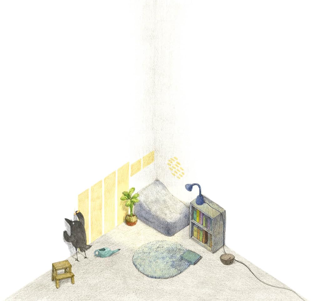 Quando si è veramente felici? Forse quando abbiamo tutto ciò che ci serve? La poltrona nuova, o la pianta che cresce rigogliosa, ci rendono veramente felici? Ci appagano? E allora perché il corvo continua a sentire che qualcosa è assente nel suo bell’angolo perfetto?