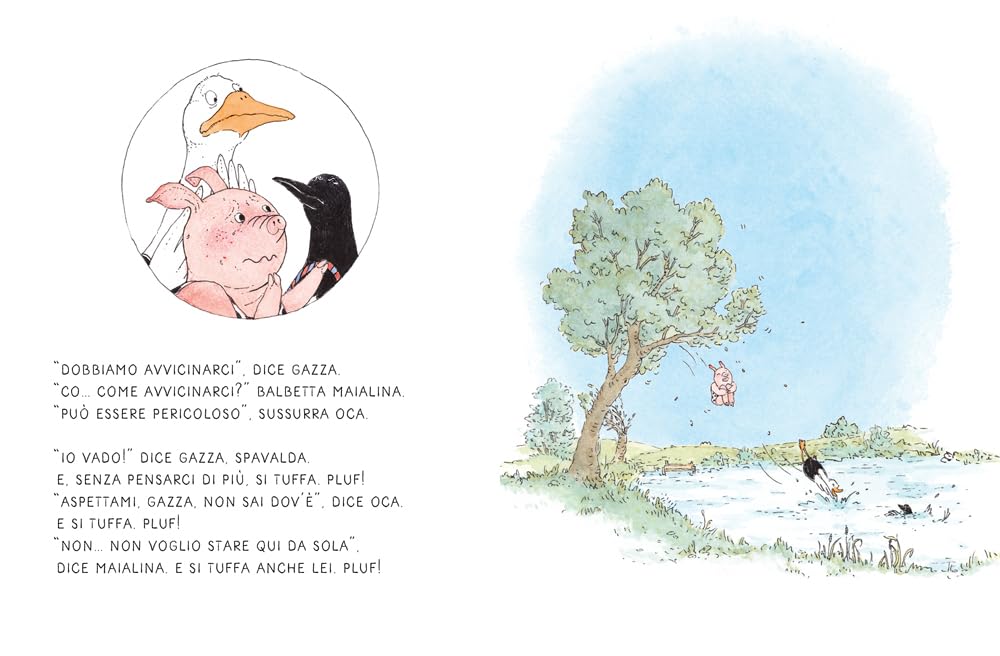 Le tre amiche raggiungono il lago in bicicletta e iniziano subito a divertirsi, ognuna a modo suo. Gazza si fa bella, Maialina schiaccia un pisolino e Oca fa il bagno. All’improvviso Oca pensa di aver visto un mostro sul fondo del lago. Agitata chiama le amiche. Cosa ci sarà nell’acqua di così spaventoso?