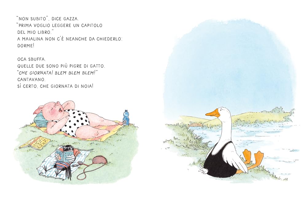 Oca, Maialina e Gazza sono le Ridarelle, tre amiche molto unite. Una mattina fa caldo e c’è un bel sole e Oca ha proprio voglia di andare al lago. Chiede subito al suo coinquilino, Gatto, se ha voglia di accompagnarla ma Gatto non ama l’acqua e così invita Gazza e Maialina.
