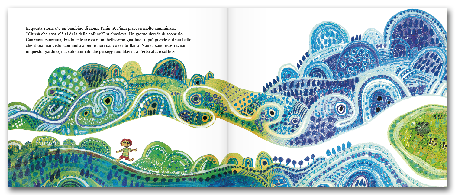 In un giardino pieno di colori un bambino di nome Pinin fa una passeggiata. Gli piace osservare i colori brillanti, l’erba soffice e alta e i molti animali che popolano il giardino.