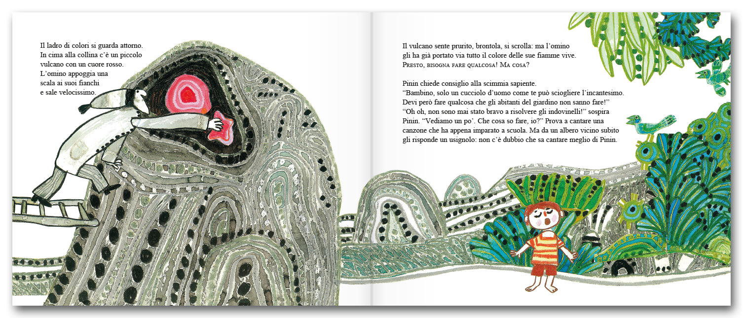 Il bambino si rende conto che quell’uomo è un ladro di colori e vuole fermarlo prima che faccia ingrigire tutto il giardino. Ci riuscirà?