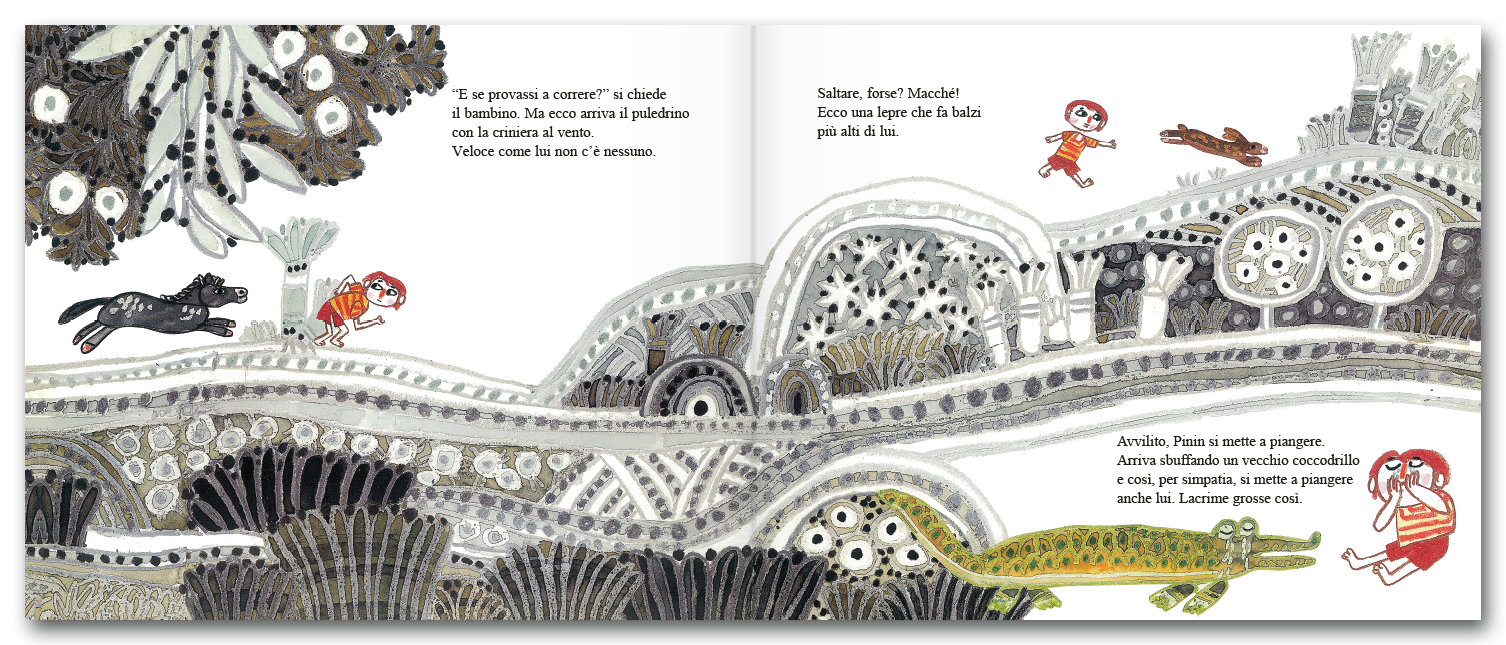 A un tratto l’aria rabbrividisce, l’erba si piega, il puledro drizza le orecchie. Compare all’improvviso uno strano omino, lungo e sottile, grigio come l’ombra della sera. Sulle spalle ha un grosso sacco e in mano ha una spugna. Che cosa vorrà fare?