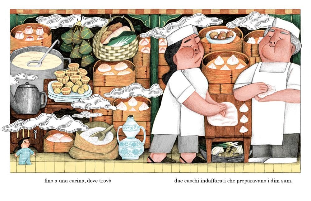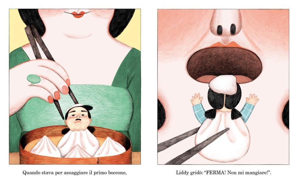 L’agitazione è talmente tanta che la bambina sogna di arrivare nel palazzo dell’imperatrice, di finire in una ciotola gigantesca di impasto ed essere scambiata proprio per un Dim Sum. Per fortuna l’imperatrice si accorge dell’errore e invita Liddy a mangiare insieme a lei. Che bontà! Dim Sum di ogni tipo e ripieno – maiale, pollo, gamberi – e anche quelli dolci. Liddy ha la pancia tonda e piena e si sveglia con un gran sorriso perché sa che quello è il giorno in cui ne mangerà tantissimi.