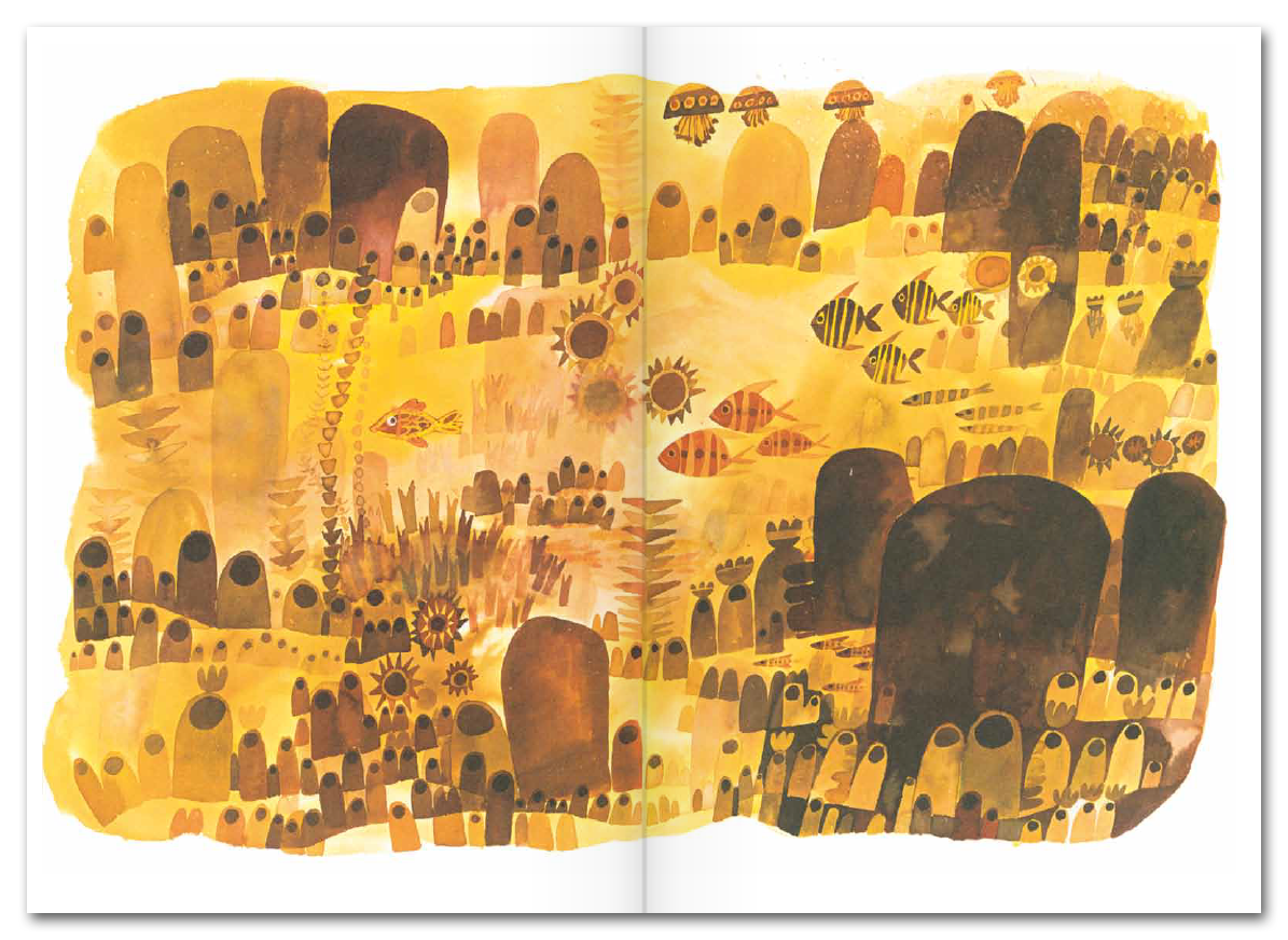 Le illustrazioni di Štěpán Zavřel sono una gioia per gli occhi. I fondali spumeggiano di verde mentre le barche dei pescatori gettano le reti. Nuotiamo nell’oro liquido che si tinge di rosa, arancione e rosso. Gli anemoni rigogliosi dove i pesci più piccoli cercano riparo fioriscono sulla pagina e che splendore la tana della Piovra che sembra fusa nell’oro. Ogni pesce turbina e vortica perché nulla è immobile nel mare.