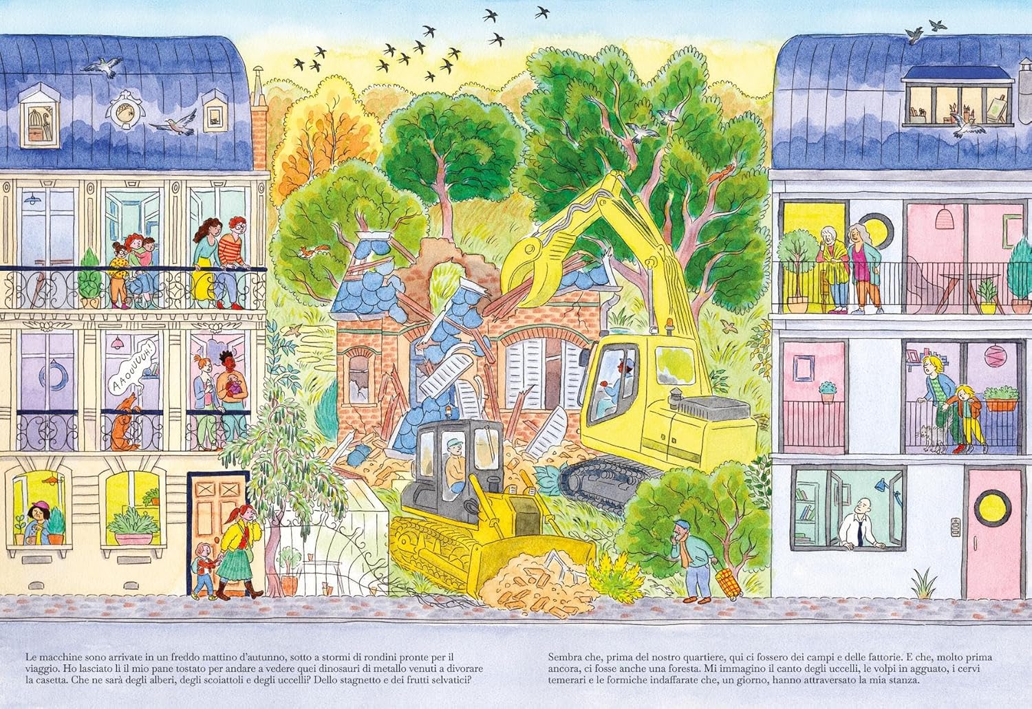 È un libro molto bello e ricco di idee preziose. Troppo spesso nelle città non ci accorgiamo nemmeno che tra i fili d’erba, sugli alberi o nel cielo c’è tutta una vita che si muove veloce. Un cortile come quello descritto è un bene prezioso da curare con attenzione per spiegare da subito che sulla Terra non ci sono esseri viventi più importanti di altri ma che il rispetto è il primo passo per la coabitazione.