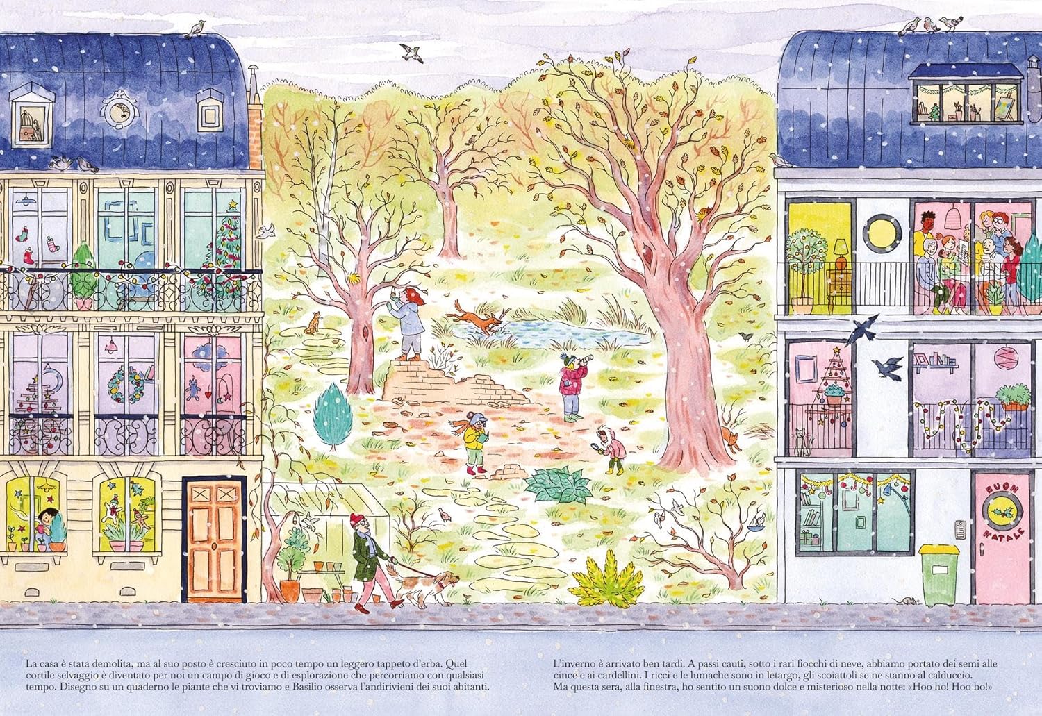 Dafne e Basilio, così come tutti gli abitanti del quartiere, si rendono conto che quel giardino abbandonato è un dono che va salvaguardato. Osservare la natura da lì è speciale. Il cortile diventa ben presto luogo di aggregazione e di crescita, di serate estive sotto le stelle, di pomeriggi giocosi. Tutto è più bello. Gli animali vivono sereni. Gli insetti hanno hotel a disposizione, gli scoiattoli cibo in abbondanza.
