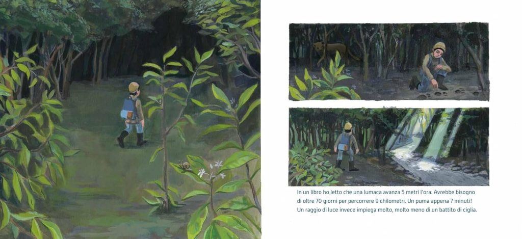 La difficoltà della distanza, della fatica, della volontà di studiare e imparare e conoscere, che grazie alle piccole cose da osservare lungo il percorso si alleggerisce e rende quasi piacevole il viaggio. Anche se sappiamo che non è proprio una passeggiata così facile e leggera, la possibilità di scoprire nuove cose, contare immagini lungo il percorso, fare esperienza con i numeri e le equivalenze (9 chilometri sono 15.000 passi, in 9 chilometri ci stanno le 10 case più grandi del mondo, 9 chilometri sono un nove e tre zeri che camminano ordinati in fila…), rallegra il cammino e aiuta il bambino ad arrivare a scuola nonostante il freddo e la fatica (“ma camminando non si sente”).