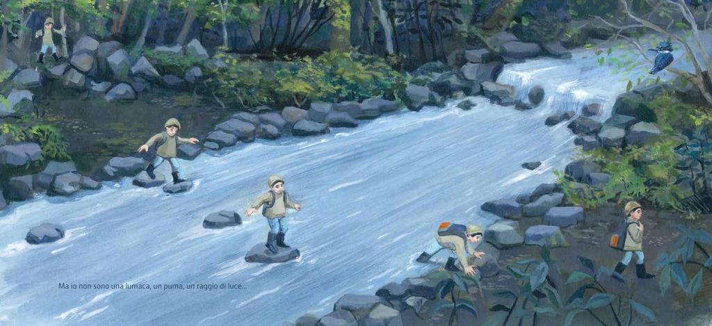 La difficoltà della distanza, della fatica, della volontà di studiare e imparare e conoscere, che grazie alle piccole cose da osservare lungo il percorso si alleggerisce e rende quasi piacevole il viaggio. Anche se sappiamo che non è proprio una passeggiata così facile e leggera, la possibilità di scoprire nuove cose, contare immagini lungo il percorso, fare esperienza con i numeri e le equivalenze (9 chilometri sono 15.000 passi, in 9 chilometri ci stanno le 10 case più grandi del mondo, 9 chilometri sono un nove e tre zeri che camminano ordinati in fila…), rallegra il cammino e aiuta il bambino ad arrivare a scuola nonostante il freddo e la fatica (“ma camminando non si sente”).